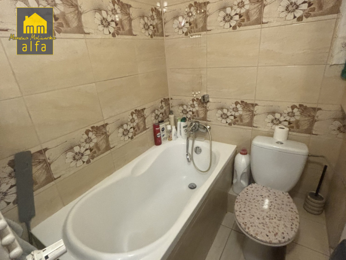 W pokojach na podłodze panele na ścianach gładź , w łazience płytki na podłodze i ścianach na wyposażeniu wanna.