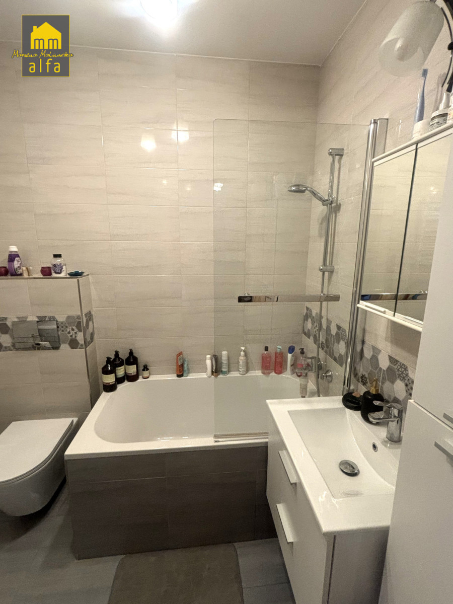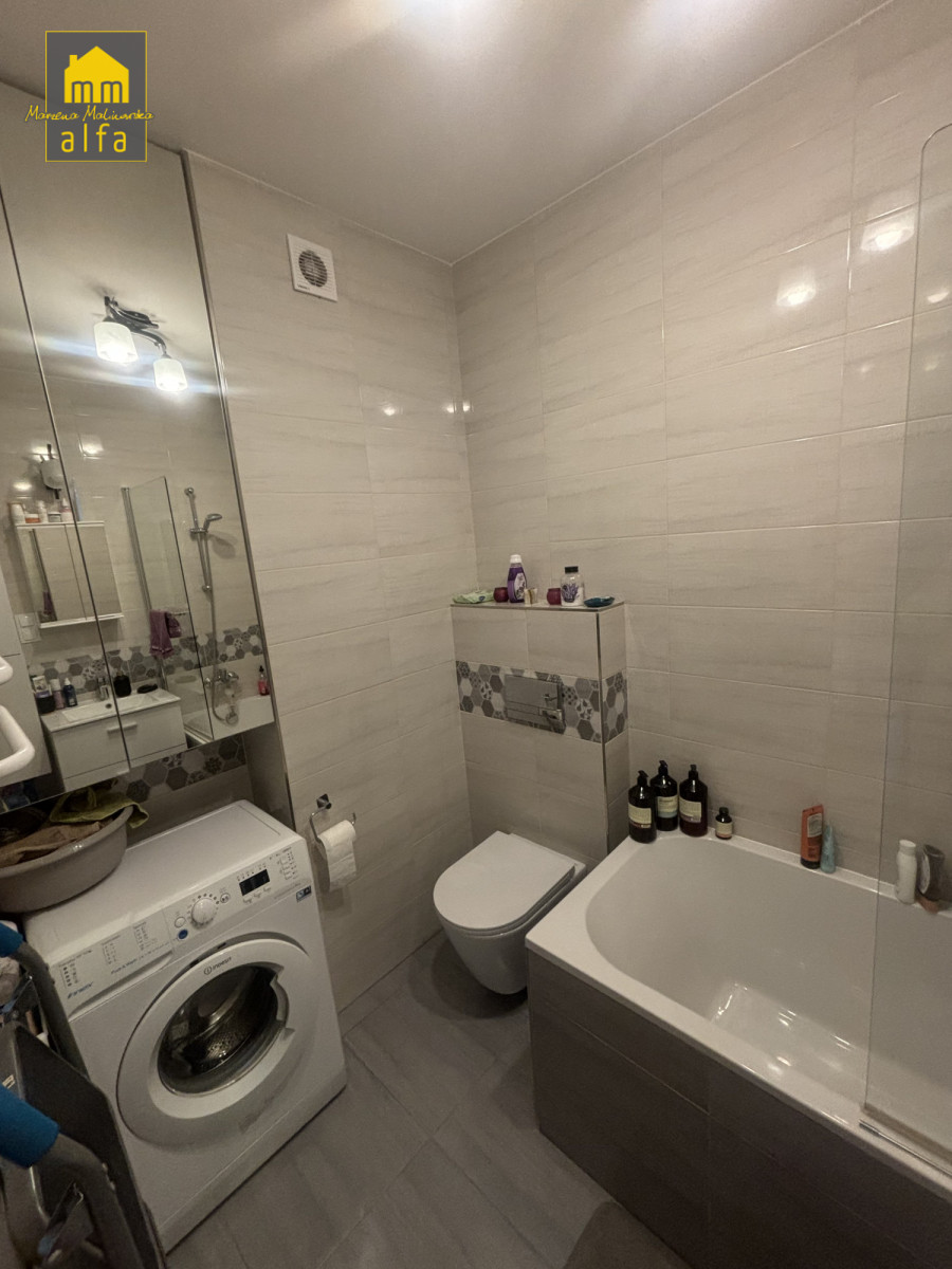 Łazienka razem z WC, na wyposażeniu wanna, wysoka jakość wykończenia.